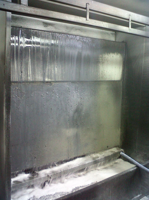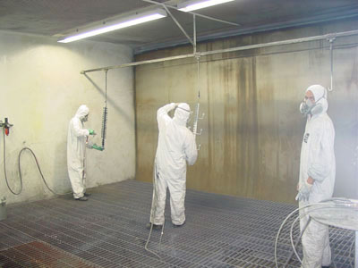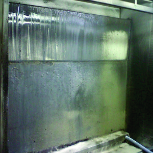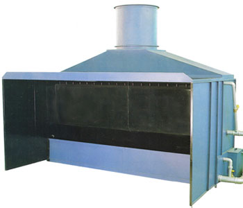 Cabina de pintura com tripla cortina d’água composta de: gabinete confeccionado em chapa e perfilados de aço carbono galvanizada, corpo de lavagem e rede hidráulica para interligar a bomba, o tanque de transbordo e a árvore de bicos pulverizadores. Atualmente é o melhor método para descontaminar o ar em áreas de pintura, com uma eficiência muito superior as demais.
